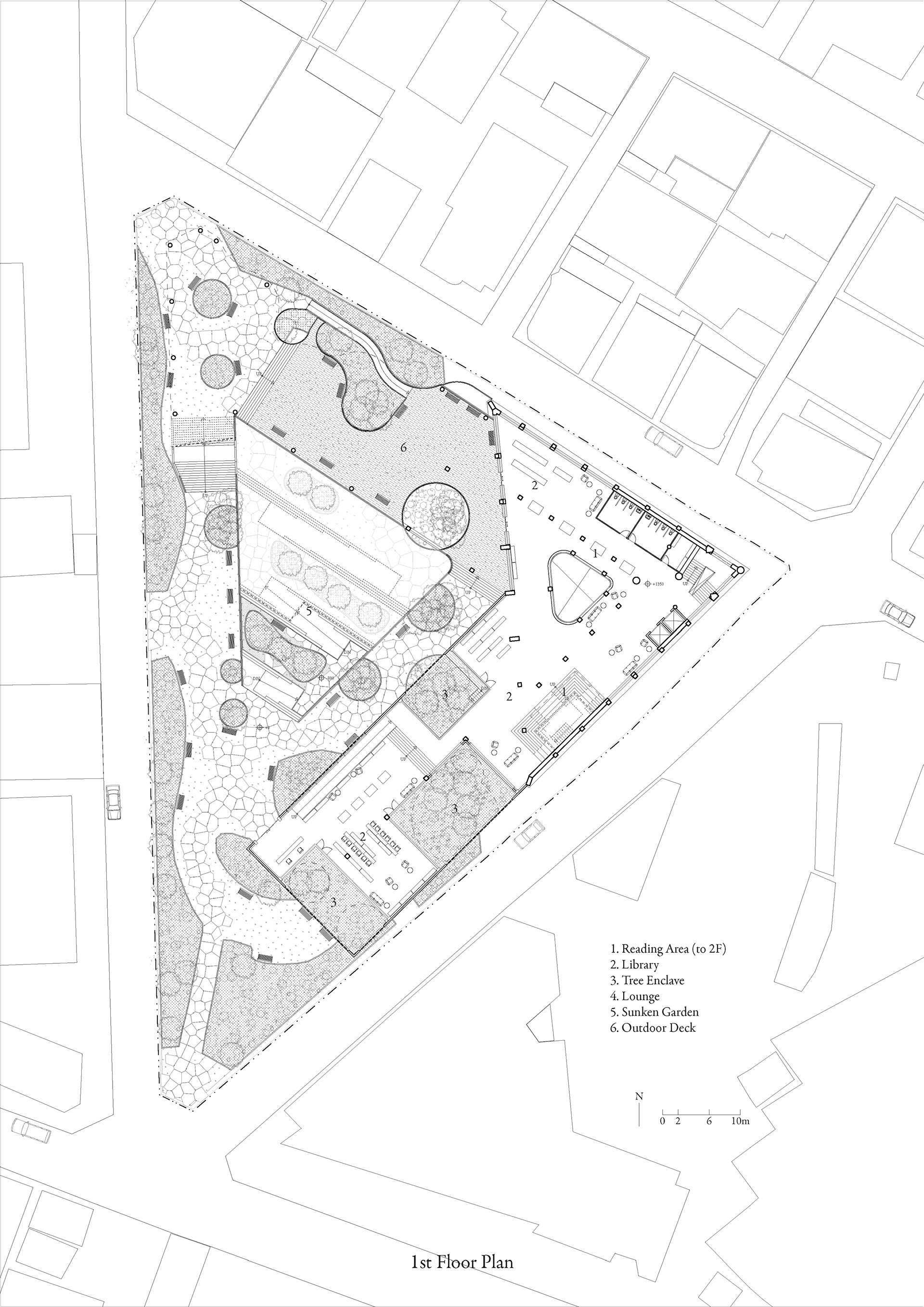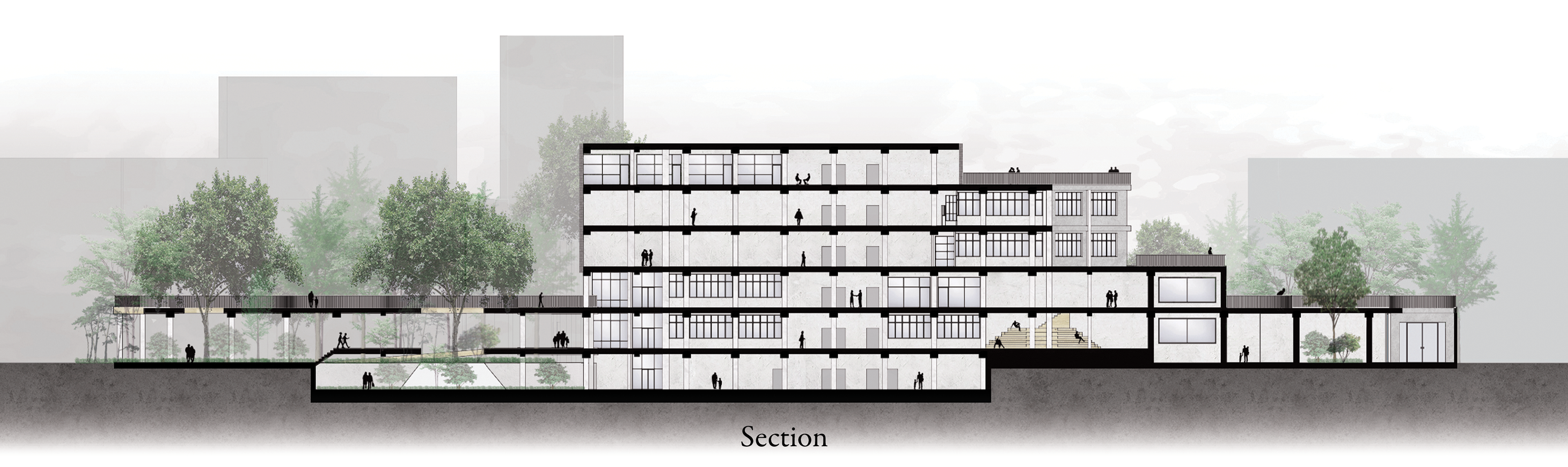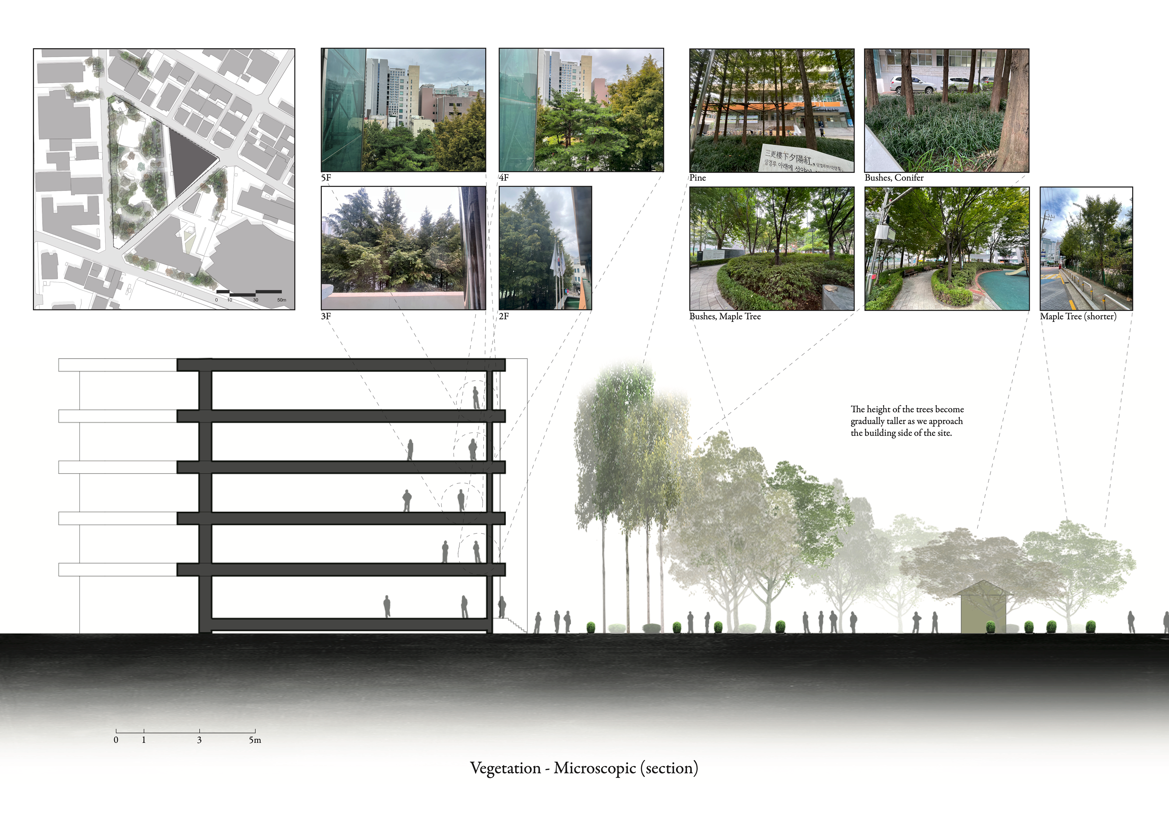 The site is located in Dongdaemun-Gu. This place is characterized by the lack of vegetation, the least out of all the districts in Seoul. In contrast, the existing Usangak Children’s Park is defined by the rich vegetation, highlighted by the tall trees that enclose the building. The project aims to seamlessly integrate the new programs with the existing library while considering the plan so the green and gray gradually circulate within the site.