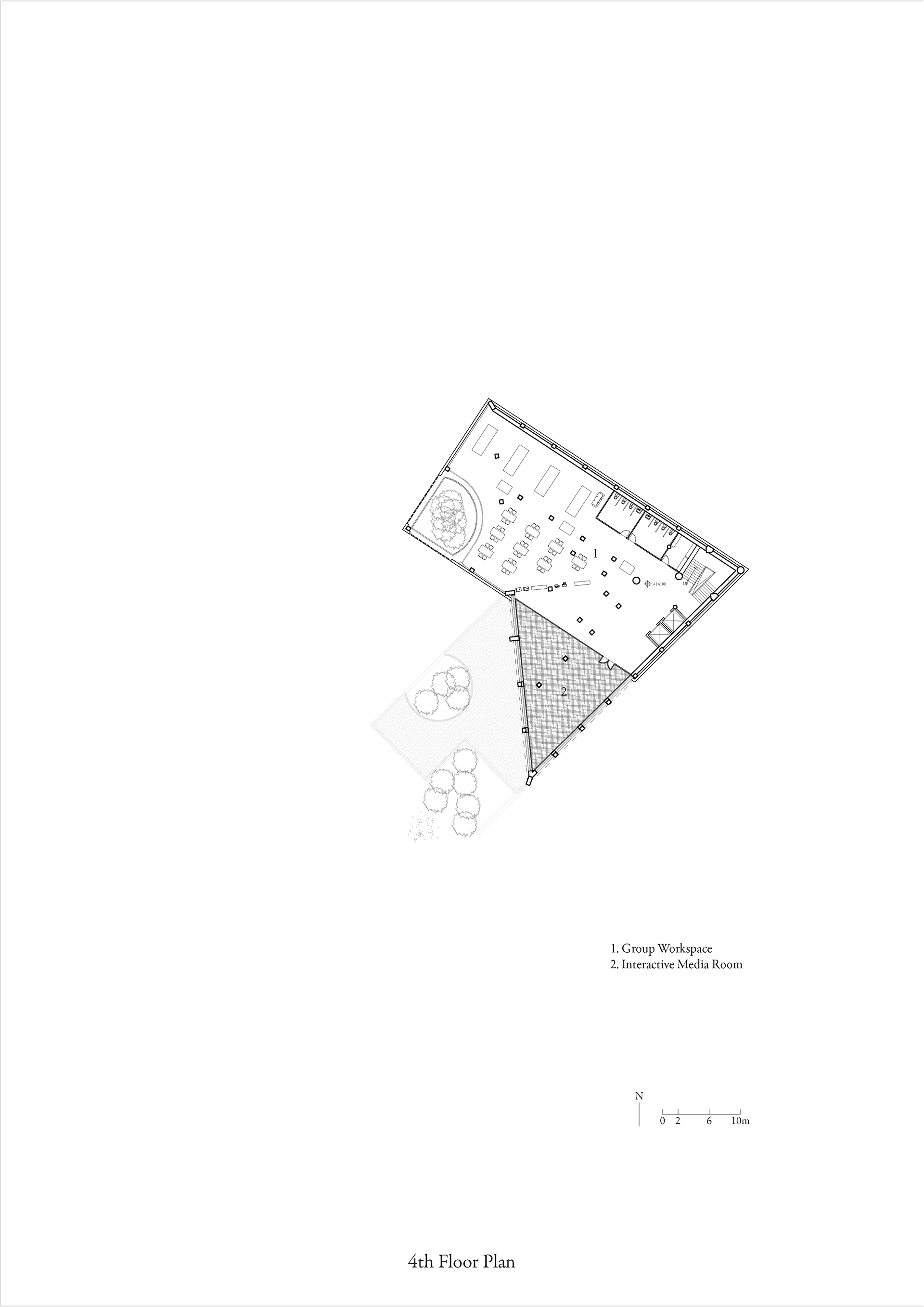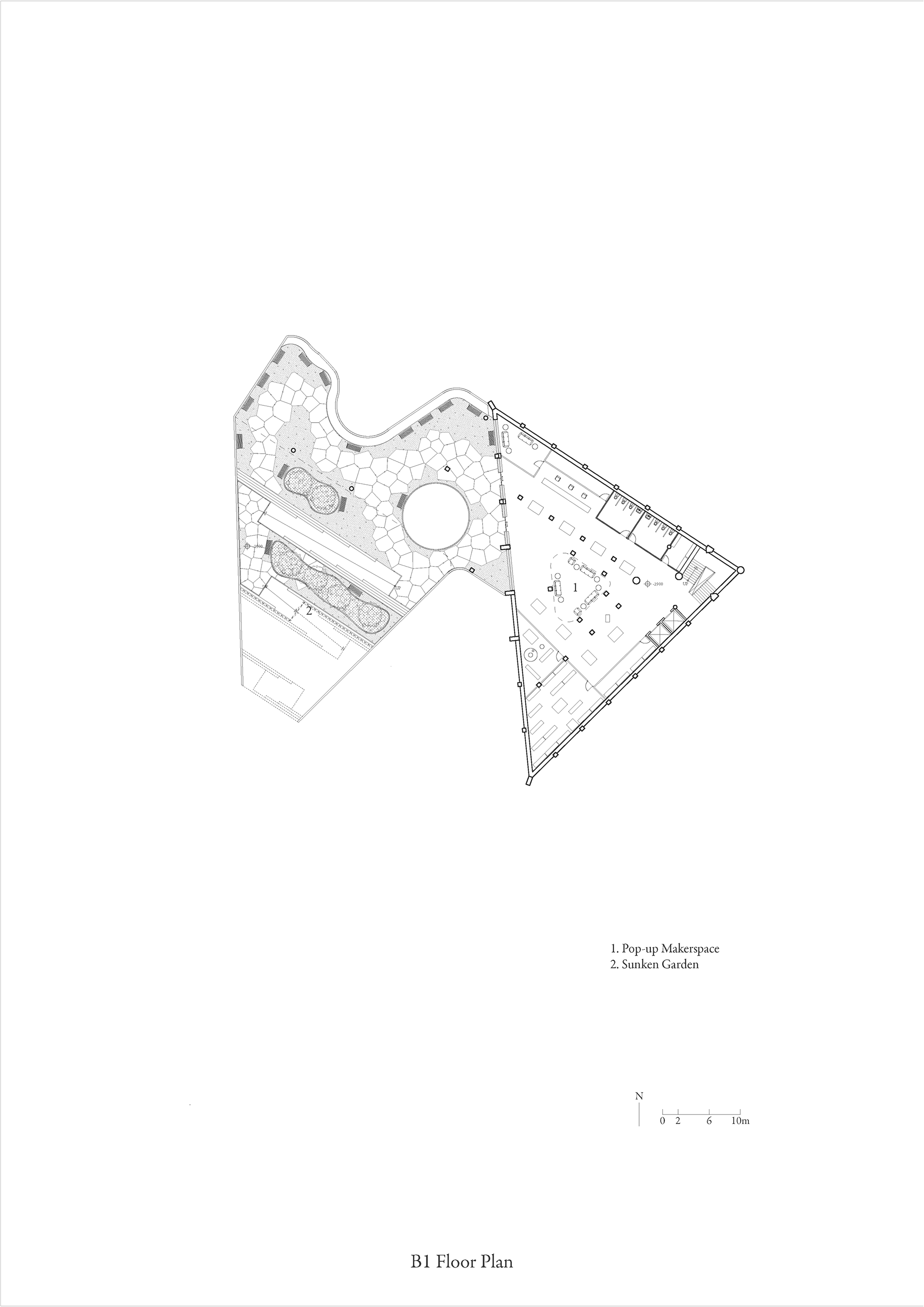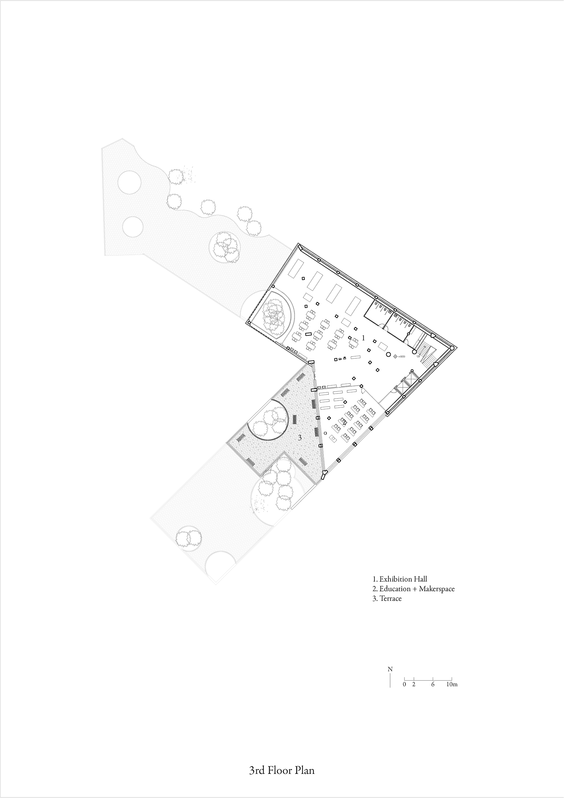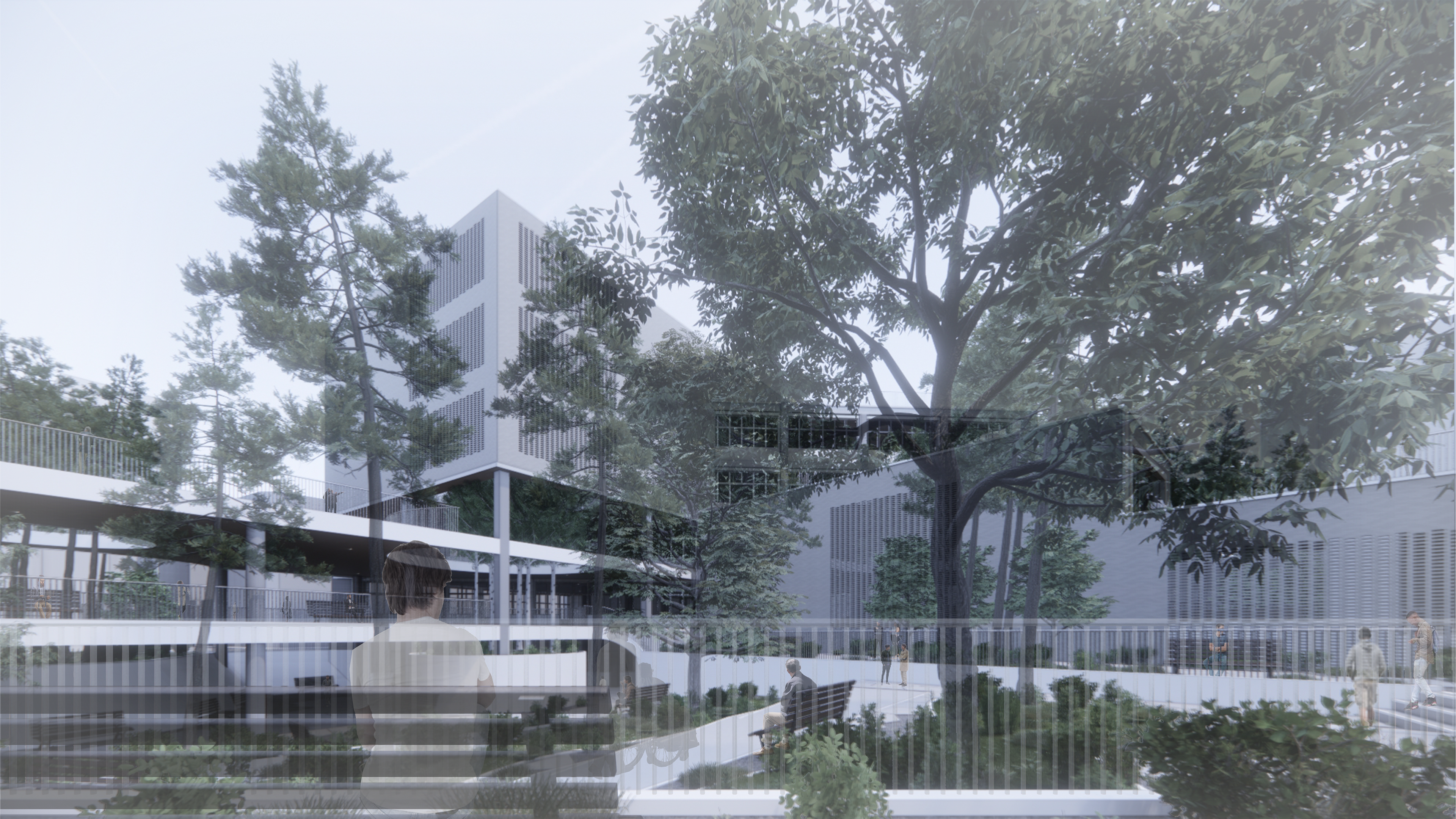 The site is located in Dongdaemun-Gu. This place is characterized by the lack of vegetation, the least out of all the districts in Seoul. In contrast, the existing Usangak Children’s Park is defined by the rich vegetation, highlighted by the tall trees that enclose the building. The project aims to seamlessly integrate the new programs with the existing library while considering the plan so the green and gray gradually circulate within the site.