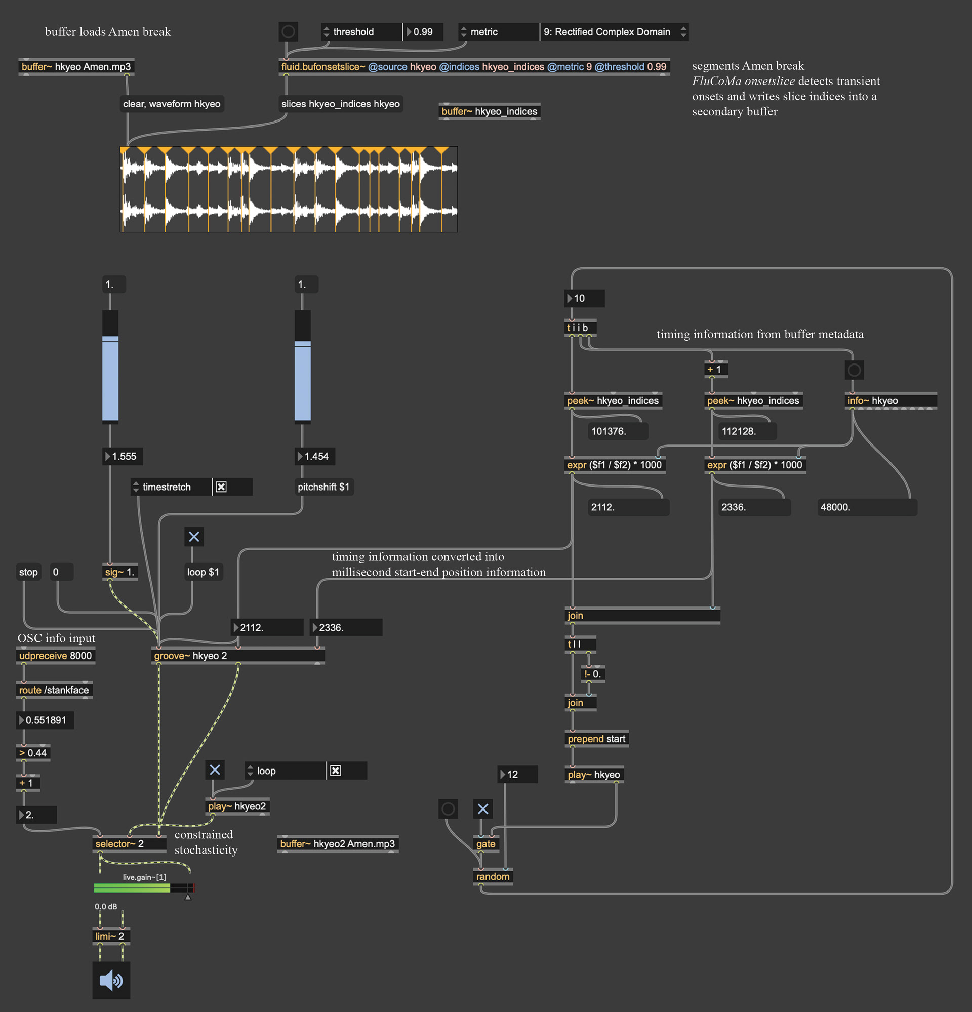 This Max patch implements a stankface-driven, slice-based audio playback system that connects gestural intensity to granular control over prerecorded material. An amen break is loaded into a buffer and segmented using Fluid Corpus Manipulation's onsetslice, which detects transient onsets and writes slice indices into a secondary buffer. These indices define musically meaningful micro-phrases that can be accessed nonlinearly rather than through linear playback. Timing information is derived from buffer data (peek~, info~) and converted into start-end position information for playback.