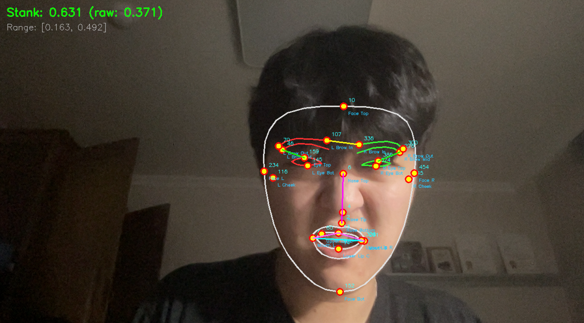 At the core of the system is a facial analysis pipeline built with MediaPipe Face Mesh. High-resolution facial landmarks are extracted in real time and normalized relative to overall face dimensions to ensure robustness across different users and camera positions. From these landmarks, a composite “stankface index” is computed using multiple micro-expression features, including nose compression, lip ovalness, eyebrow contraction, mouth narrowing, eye squinting, and cheek elevation. Each feature is weighted and combined into a single continuous parameter, which is then adaptively normalized over time to expand the expressive range and accommodate individual facial habits.